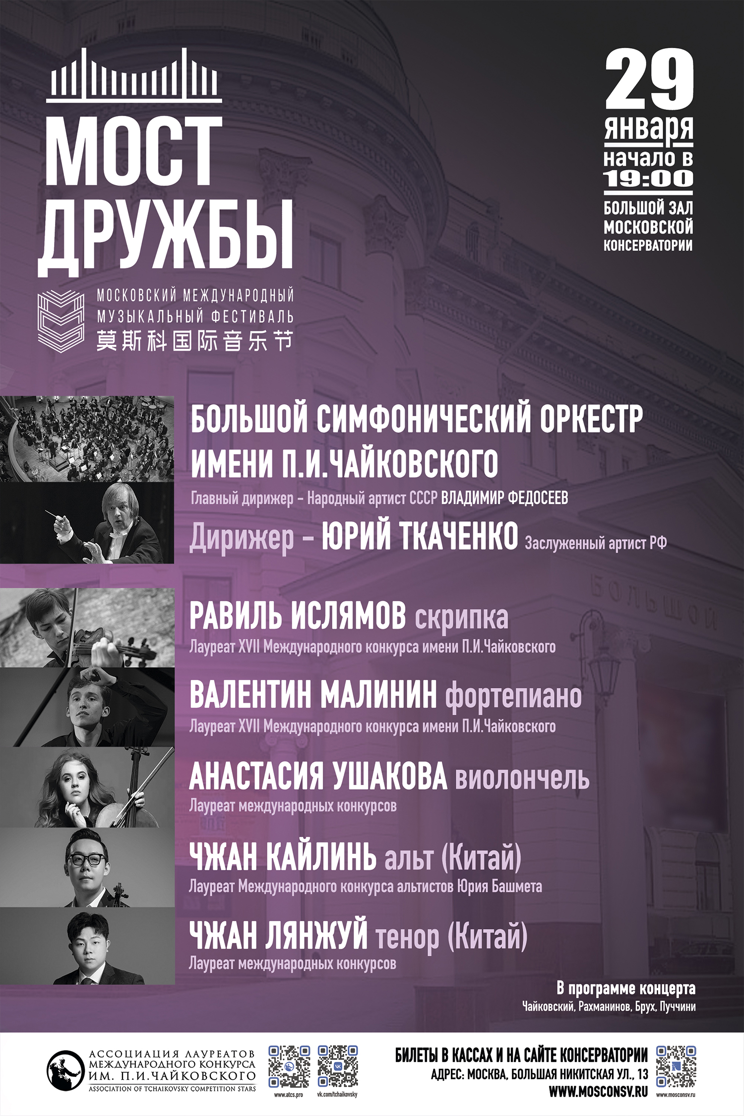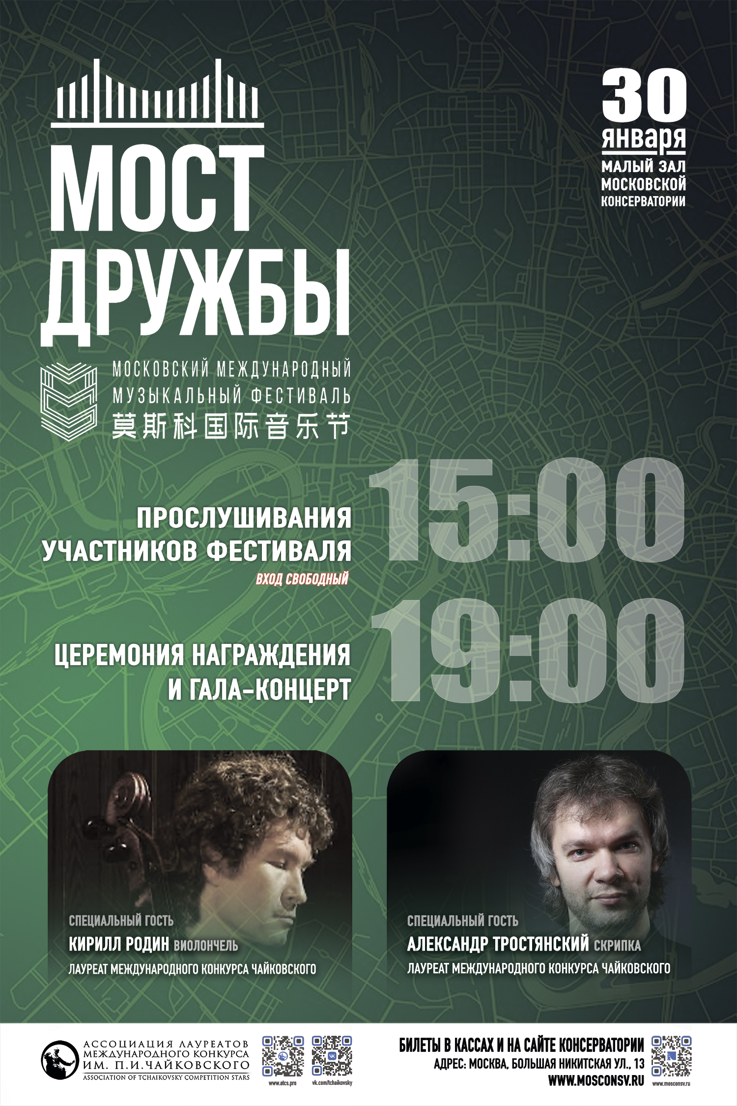 Концерт завершает программу Московского международного музыкального фестиваля «Мост Дружбы». В 14.00 в Малом зале Московской консерватории пройдут финальные прослушивания участников конкурса и объявление победителей. В 19.00 состоится гала-концерт с участием звёзд Международного конкурса имени П.И.Чайковского Кирилла Родина (виолончель) и Александра Тростянского (скрипка), а также торжественное закрытие фестиваля.